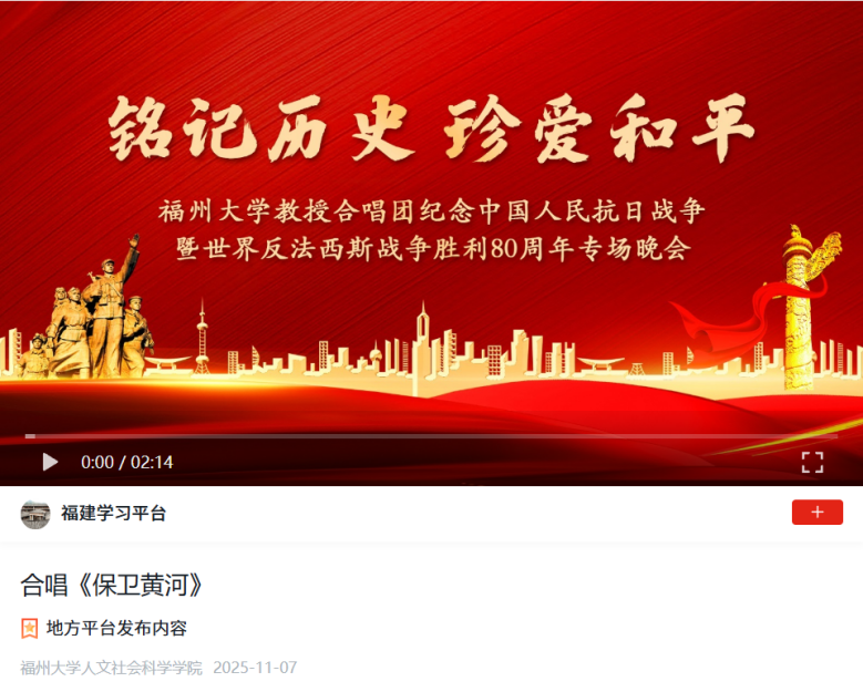 演出聚焦本场音乐会共带来18个作品演出 曲目编排精妙 涵盖中外经典 尽显老师们的深厚艺术修养与多元音乐视野 在《保卫黄河》的怒吼与《松花江上》的悲怆中 演出震撼开场 双钢琴《黄河船夫曲》奏出奋斗号子 朗诵《胜利纪念日,我看到那束光》照亮和平的来之不易 一曲《十面埋伏》尽显古韵杀机 《同心共筑中国梦》舞出时代壮志 男声独唱《骏马奔驰保边疆》豪情万丈 女声小组唱《长城谣》悠远凄美 《游击队之歌》的机智诙谐、 《啊朋友再见》的慷慨洒脱 以及《南泥湾》《映山红》等联唱作品的优美深情 无不引发深切共鸣 一曲《追寻》更是诠释了奋斗主题 尾声的《怒吼吧!黄河》《在太行山上》再度唱响 多声部合唱如惊涛拍岸 《没有共产党就没有新中国》《歌唱祖国》铿锵有力 以时代强音致敬光辉历程 观看指南您只需复制下方链接至浏览器打开 即可进入“学习强国”平台专题页面 沉浸式感受这场高水准的艺术盛宴//article.xuexi.cn/articles/video/index.html?share_to=wx_single&study_style_id=video_default&part_id=14724049218291636450&art_id=11106466290832408348&cdn=https%3A%2F%2Fregion-fujian-resource&source=share 诚挚邀请您共聚云端 聆听这场华彩乐章!