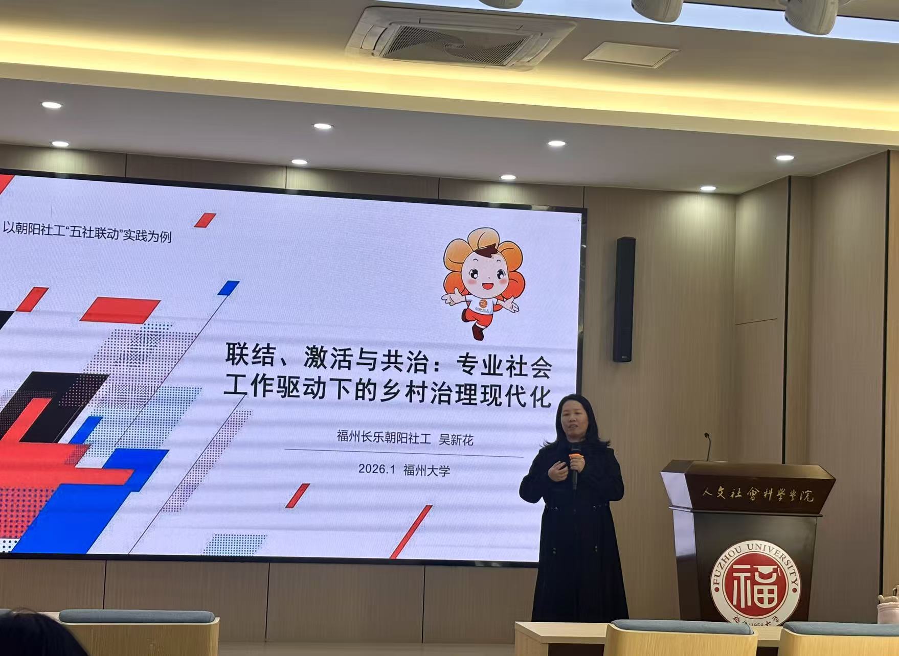 为深化我院社会工作专业研究生对基层治理的了解,我院邀请长乐区朝阳社会工作服务中心党支部书记和总干事吴新花,于2026年1月13日开展主题为“联结、激活与共治:专业社会工作驱动下的乡村治理现代化”的工作坊。