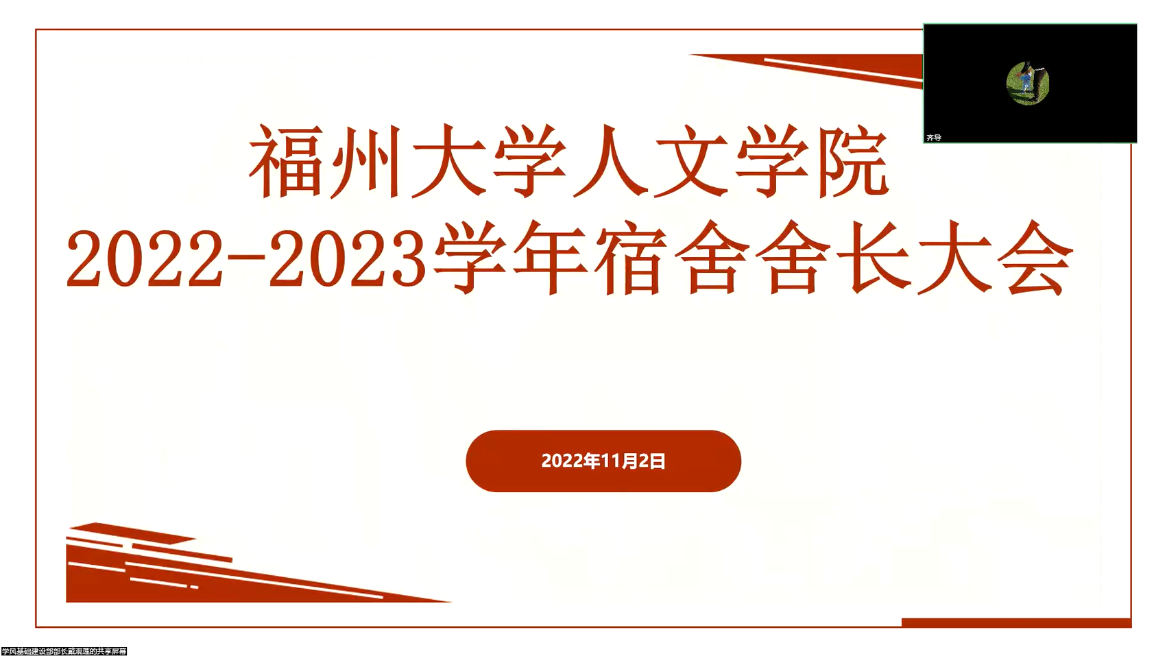 人文学院2022-2023学年宿舍舍长大会,人文学院党委副书记陈永福教授出席本次大会,院团委齐朝阳书记主持会议,人文学院全体宿舍长参加本次会议。