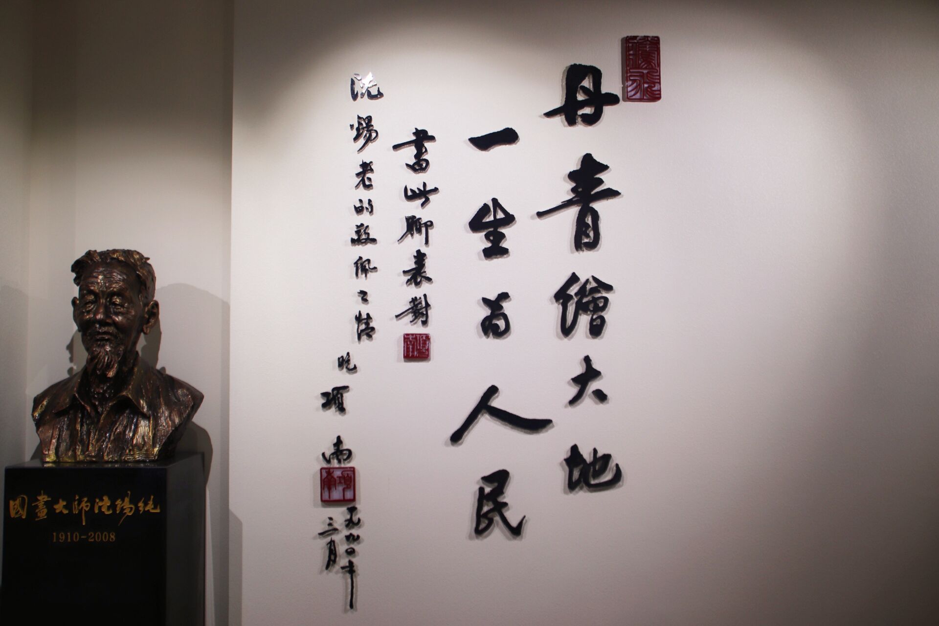 初步馆内,敞开的木门间一道白底“照壁“点亮了视野,壁上赫然书有“丹青绘大地,一生为人民”字样,短短十字似把沈老先生的一生道尽。他以取精用宏之技艺,传大美之佳作,育艺界之英才,用翰墨描绘拳拳赤子之心,将殷殷爱国之情融入丹青间。