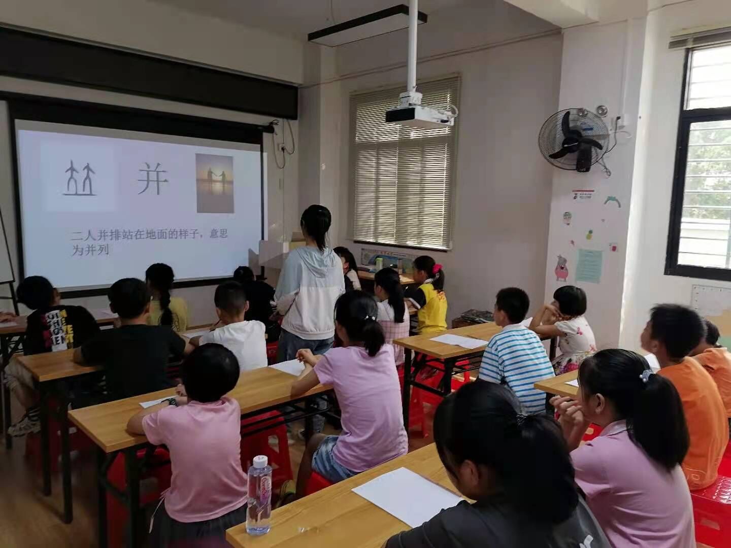 第三场活动由2019级汉语言文学的康仪欣同学主讲,她发挥自己的专业专长,向朋友们展示了甲骨文的美。甲骨文是一种古老的刻在龟甲或兽骨上的文字,拥有悠久的历史。活动开始,康仪欣同学先给小朋友们“卖关子”,先向他们展示甲骨文以及提示的联想图片,让他们开动脑筋猜猜到底是什么字。小朋友们发挥想象力,争先回答。在对甲骨文有了一定认知后,他们还认认真真地在纸上摹写起甲骨文来。此外,在“摆字形,猜文字”游戏中,他们发挥出自身的“表演天赋”,和小伙伴们配合摆出一个个字,引得大家哈哈大笑。最后的投壶游戏中,小朋友们以铅笔、橡皮代箭,笔筒代壶,按序排队,轮流投掷,于嬉笑玩乐收获丰富知识。