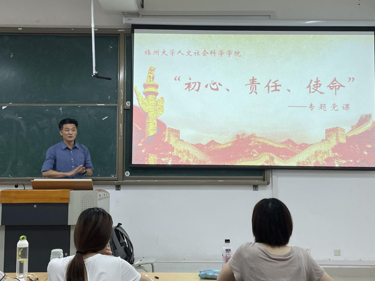 2021年5月12日上午,人文学院党委书记王群在铜盘校区A208教室开展了以“初心、责任、使命”为主题的专题党课。研究生社会学党支部、研究生社会工作研1班党支部和研究生社会工作2班党支部的党员和积极分子参与了本次党课学习。