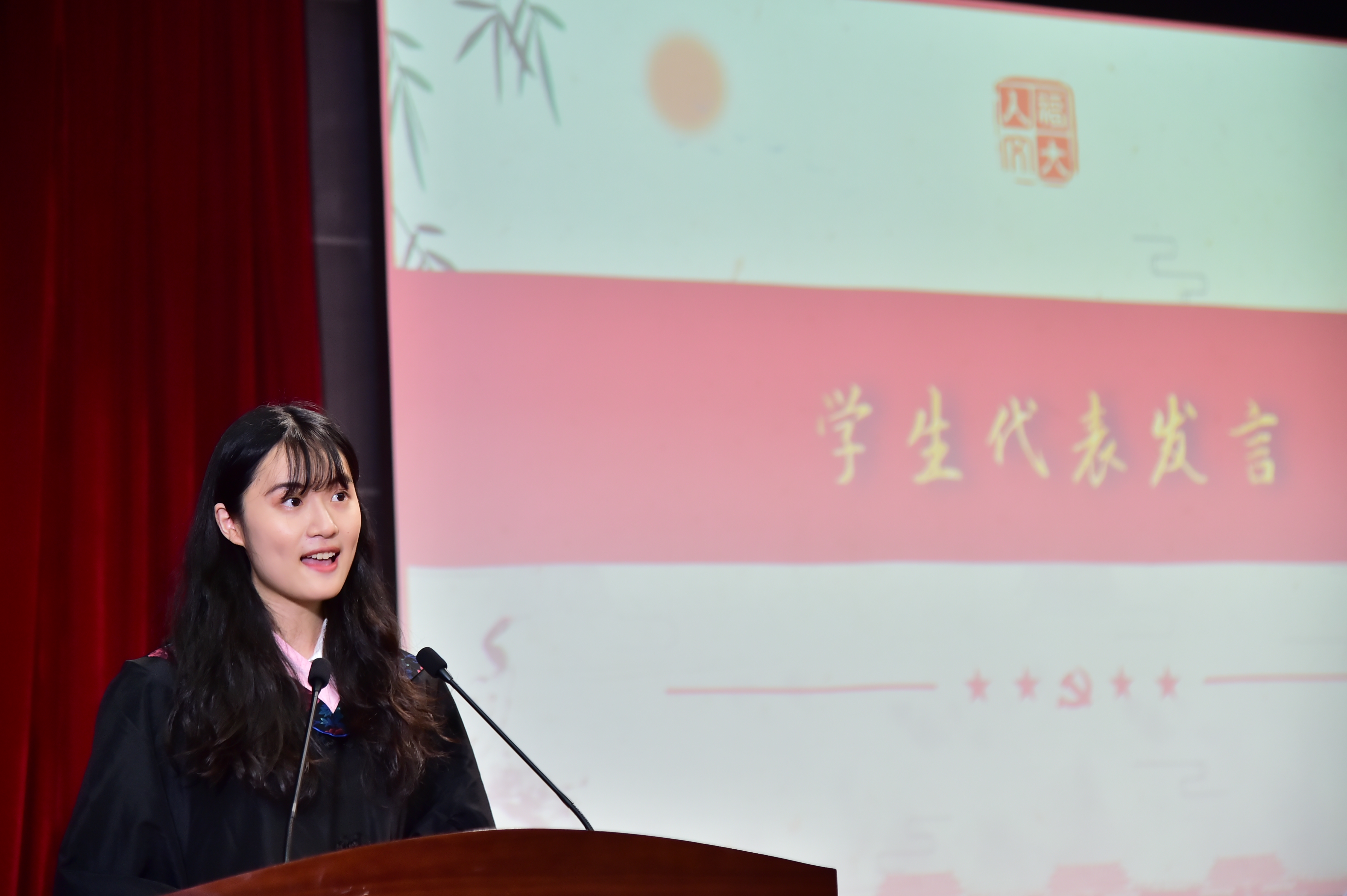 全体起立奏唱国歌,毕业典礼正式开始。汉语言文学专业本科生杨舒涵和社会工作专业研究生赵蓉作为学生代表在典礼上发言,他们表达了对师长的感激,并且表示自己将肩负使命,在新时代将自己与民族复兴结合在一起,为实现中华民族伟大复兴的中国梦做贡献。