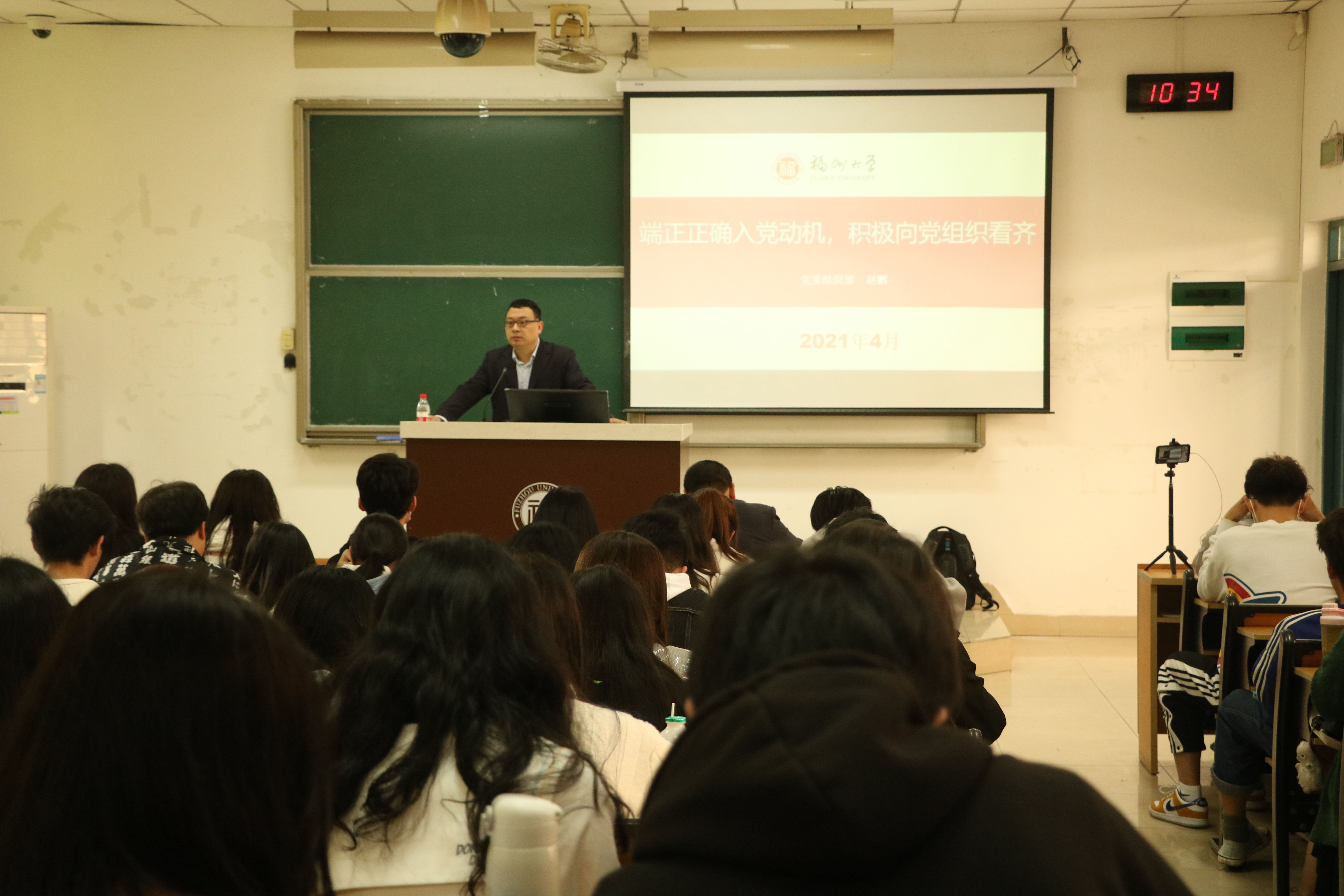 4月17日上午10点30分,人文学院在文1楼105教室举办了由党委组织部赵鹏老师主讲的“端正正确入党动机,积极向党组织看齐”主题讲座。人文学院入党积极分子培训班成员参与本次讲座,其中铜盘校区的成员在B314教室通过观看线上直播的方式参与讲座。