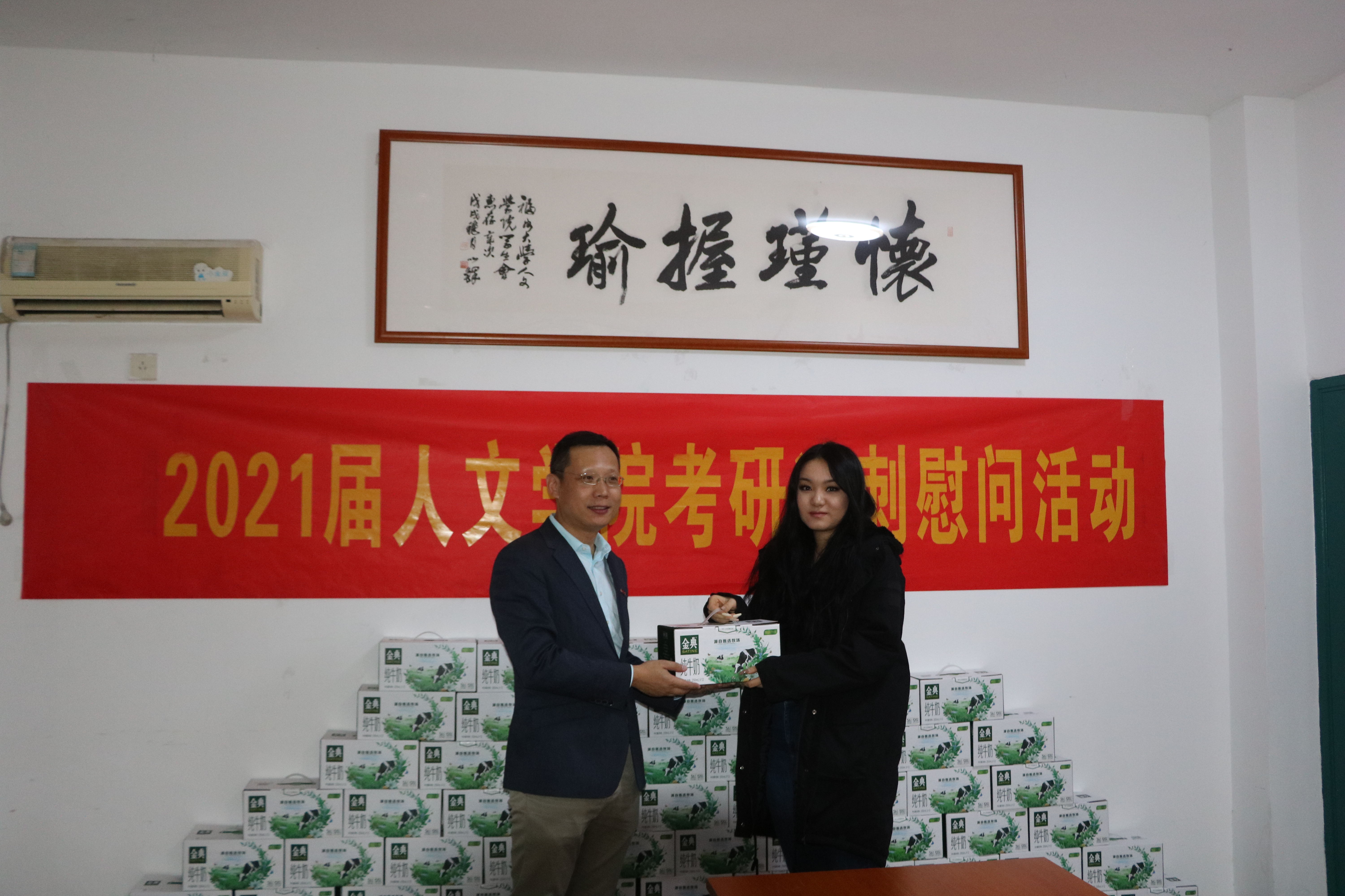 慰问活动中,郑志刚副书记与齐朝阳书记同在场考生亲切交谈,对各位学子无惧挑战,迎难而上,积极复习迎考的精神气象给予了充分肯定。同时针对考研学子最后冲刺阶段的学习,郑志刚副书记鼓励同学们要在考研冲刺阶段要注意身体,劳逸结合,细心做好考前各项准备工作,同时要调整好心态,增强自己的信心,坚持到底。考研学子们纷纷表示很感激学院给予的支持,而自己也将会坚定信念,不负师长的殷切期望。最后领导们为每一位同学送上了慰问品,并祝愿同学们能够金榜题名。一箱箱牛奶里装满了学院师生对考研学子满满的爱心,一句句真挚的祝福为考研学子带来了温暖。