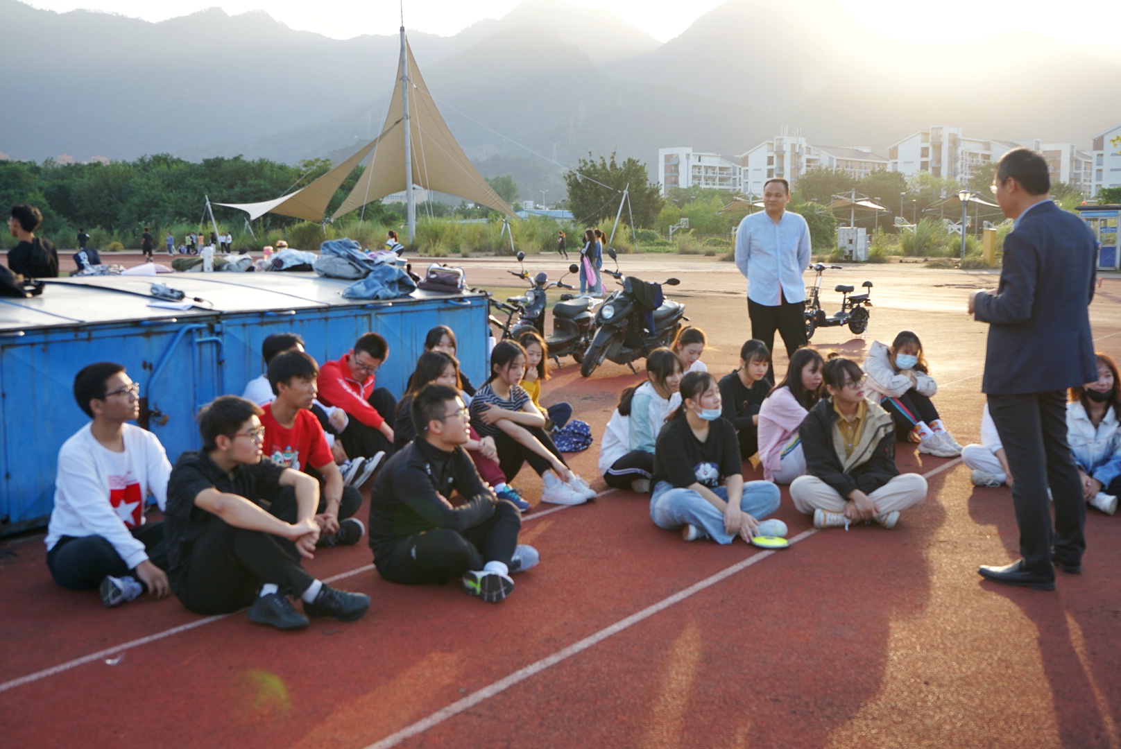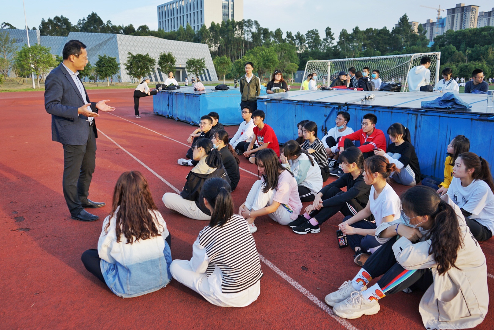 2020年10月23日下午4点,运动会动员大会在三区操场举行,人文学院党委副书记郑志刚和团委书记齐朝阳到达训练现场,为参赛运动员作动员。