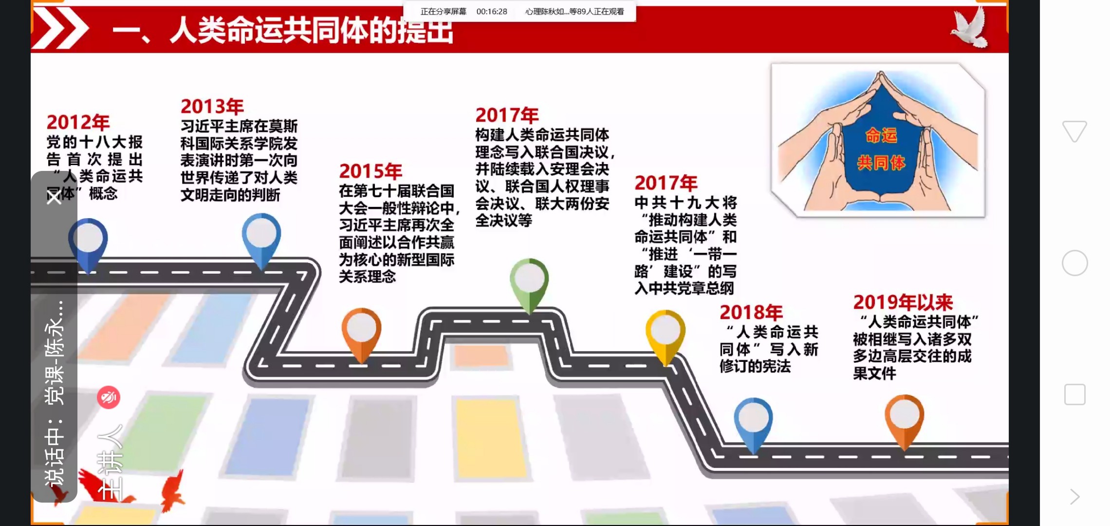 本场培训会从当今世界的时代背景谈起,通过人类命运共同体的提出、人类命运共同体的哲学蕴含、人类命运共同体的新时代意义、推动人类命运共同体建设实践、人类命运共同体建设的启示等方面介绍了人类命运共同体的理论与实践。