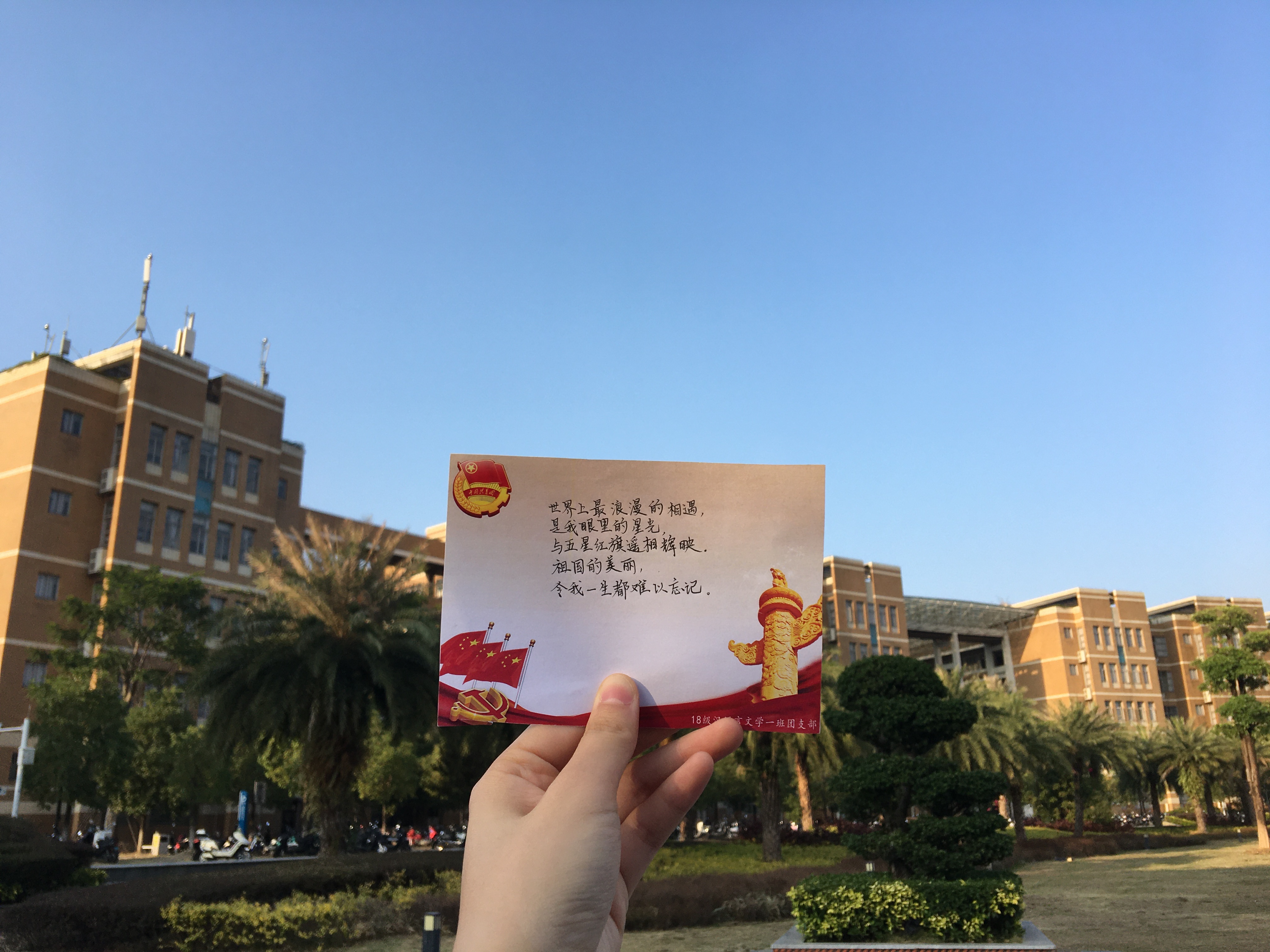18级汉语言文学一班团支部的成员们将对祖国的寄语、对党的热爱、对将来的愿景、自己的热血手写在优美的明信片上。同学们将寄语与校园中秀丽的景色合影,表达出对未来的热切期盼与对“不忘初心、牢记使命”的坚持。王国维在《人间词话》中写到:“昔人论诗词,有景语、情语之别,不知一切景语,皆情语也。”团支部团员们通过书写对祖国的赞美与祝福,并与福大各处景色结合,传递特有的情思。