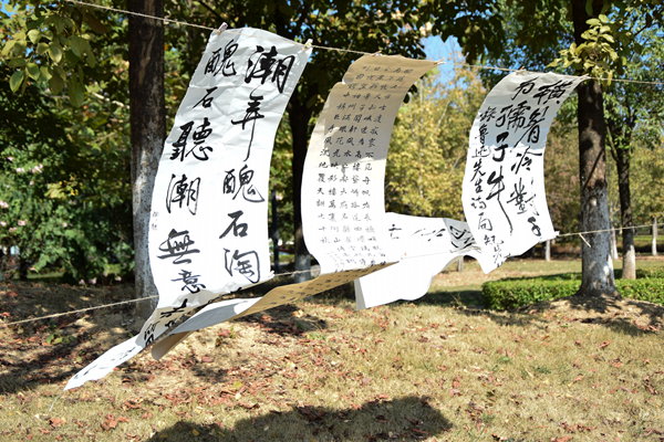 此次活动的形式丰富,有书画展览、现场书画创作、有奖竞猜及书画知识竞赛等项目。“横眉冷对千夫指,俯首甘为孺子牛,”现场展示着鲁迅的《自嘲》书法,刚劲有力,挥毫间体现鲁迅刚柔相济,敢于战斗的精神。现场还展示许多由丑石听潮书画社的书画作品,吸引行人驻足观看。现场举行的知识问答活动则抽取有关书画的问题向参加者发问,活泼有趣,参加者一时排起长队。