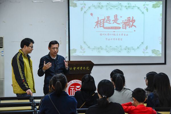 在院办202教室里,人文学院党委郑志刚副书记向归来的校友们表示了热烈的欢迎。作为首届音乐学毕业的学生,在听完郑志刚副书记对近些年来学院发展状况的描述后,潘超校友忍不住感慨:“学院如今越办越好,我感到非常幸运也感到非常幸福,感恩母校也祝福母校!”