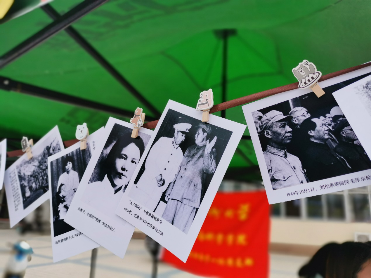 在本次活动中,三个班级的同学在活动开始前装扮活动场地。具有历史意义的照片被夹挂在帐篷前,黑白的颜色却蕴含了祖国建国至今的无数光荣时刻。被活动吸引前来的同学,有的已小试身手,有的在后方观望。