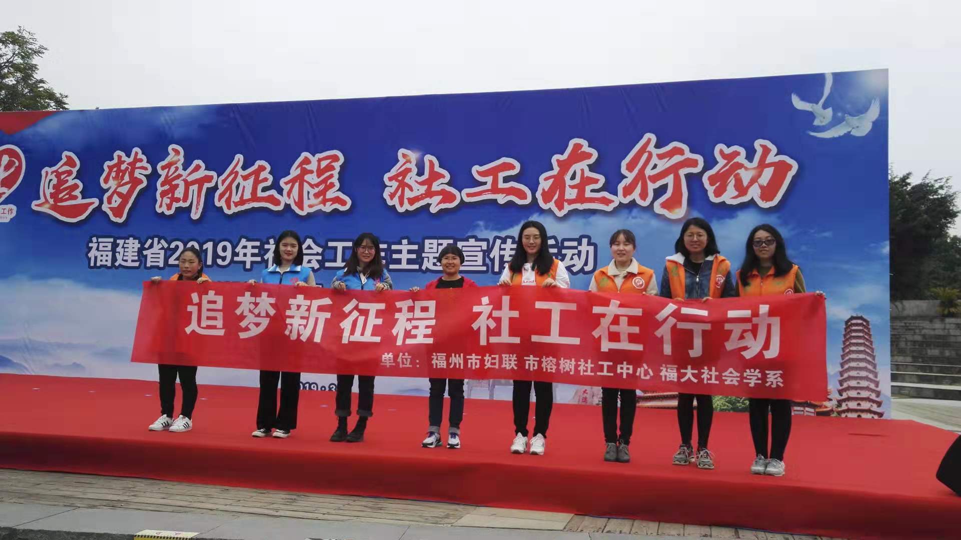 2019年3月19日上午,福州市妇联与福州市榕树社工中心、福大人文学院社会学系在温泉公园参与由福建省民政厅、福州市民政局主办的2019年省社会工作主题宣传活动。一方面,普及社会工作和慈善公益的相关知识,另一方面宣传反家暴和家庭安全的知识。这次活动向民众展示了社工风采,让大家感受到社工的专业、爱心和热情。