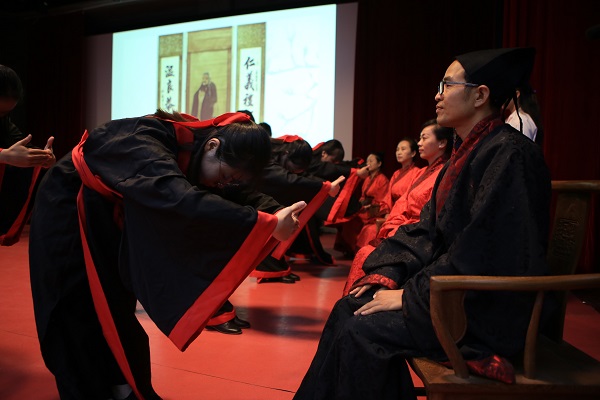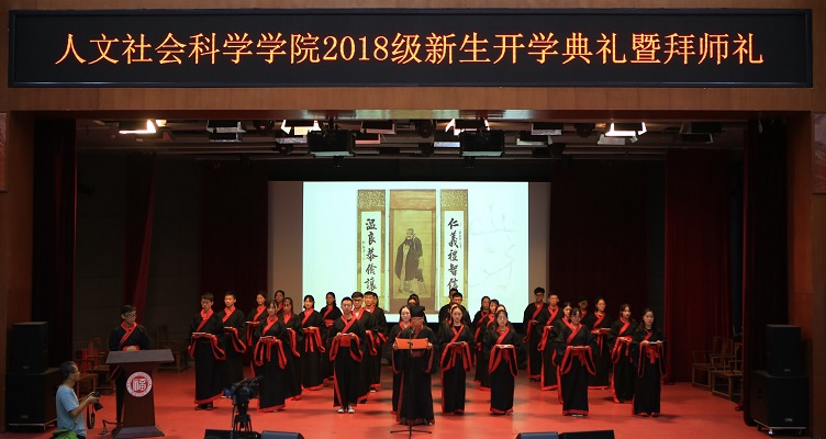 值得一提的是,此次新生开学典礼人文学院首次加入拜师礼的仪式,将传统文化进一步推广开来。教师及部分新生代表皆身着汉服,向孔子像行礼;新生手捧“束修六礼”,向教师行拜师礼,表达崇高敬意。林秋生老师手执书卷,向新生们道“立德树人”的理念,表“德才兼备”的祝愿。浓郁的传统文化气息包裹整个会堂,在座师生皆为氛围所感染。
