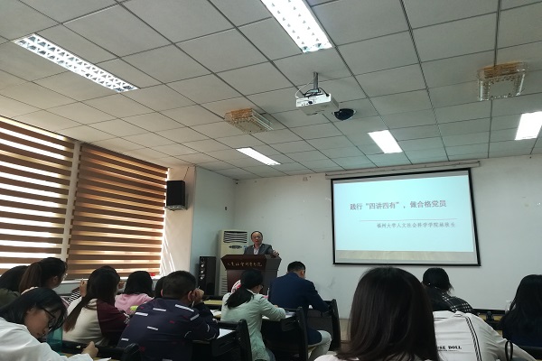 分党校第15期入党积极分子培训班开班第一讲于院办202教室顺利开展。人文学院党委林秋生书记为全院入党积极分子上了一堂生动的“践‘四讲四有’,做合格党员”专题党课。