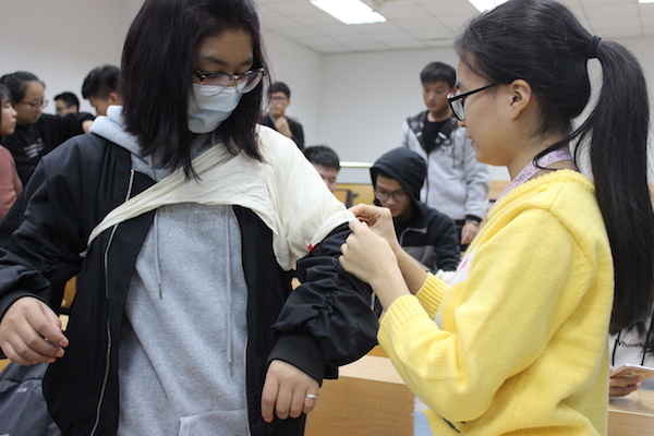 据负责人介绍,此次急救课堂是17级新生军训期间“情温凛冬,爱暖军心”红十字会主题服务站的预热活动,旨在通过生动的现场演示、有趣的游戏互动以及同学们的亲身体验,扩充大家的急救知识储备,提高大家应对危急情况的能力。值得一提的是,此次活动特别邀请请了来自校红会培训部的讲师为现场同学进行专业的急救技能培训。红会讲师为大家展示了三角巾和绷带的用法,并详细讲解了心肺复苏的原理和步骤,现场同学认真聆听,并将所学用于实践,在假人身上进行了实际操作。此外,此次活动的“你画我猜”等游戏环节寓教于乐,互动性强,同学们积极参与,在欢声笑语中收获了不少急救知识。