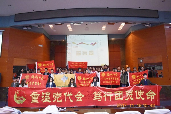 2016级社会学1班团支部与生工15级食品一班团支部、化学15级基地班团支部、外语15级英语三班团支部、机械16级机制一班团支部、经管16级市场营销团支部、化学17级化学二班团支部在嘉熙厅联合举办主题为“重温党代会,笃行团员使命”的汇报会。