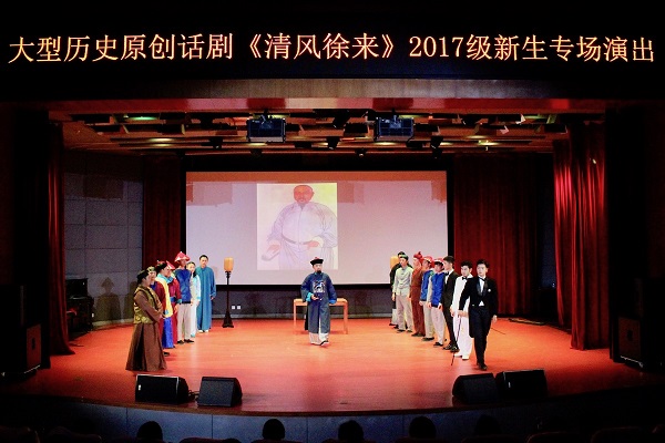 赖生话剧团承办的大型原创历史话剧《清风徐来》2017级新生专场演出于博学厅顺利举办。到场的嘉宾有校党委宣传部刘朝晖副部长、av在线看