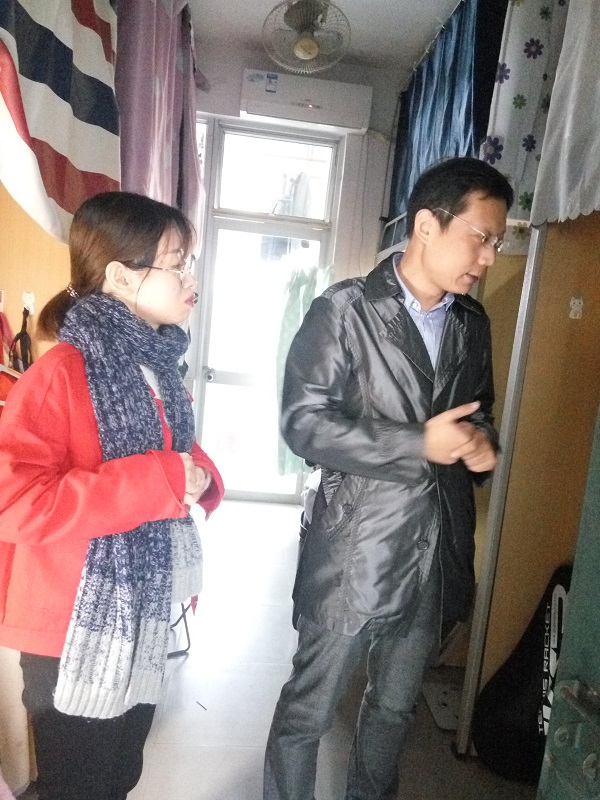 党委郑志刚副书记、团委叶阁泽书记以及2014级辅导员王亚苹老师,走访学生宿舍进行宿舍检查和暖冬慰问。