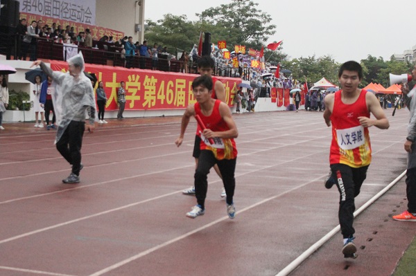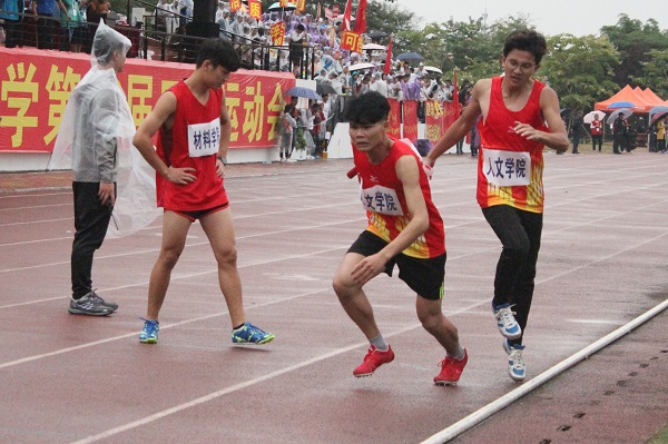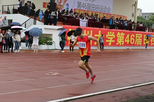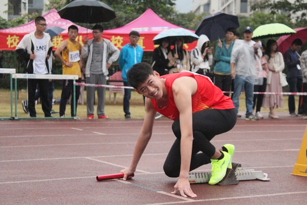 11月15日上午11点15分,4x100接力赛中,运动员们准备就绪,蓄势待发。人文学院代表队背水一战,第一棒奋力向前冲去,身上背负着重担却毫不退缩,完美的将棒接给了下一位队员。队员们接过棒后,以迅雷不及掩耳之势继续奔跑,几乎无缝对接。一棒接着一棒,是队友们勇气和信念的传递。他们最后取得了第六名的成绩,恭喜他们!