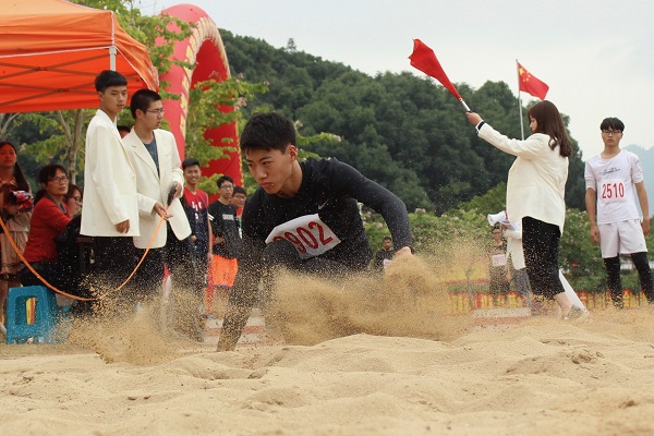 赛场上曲炙同学迈开长腿,全力冲刺,纵身一跃,在空中划出一道弧线后落入沙坑。曲炙因突出的身高优势备受瞩目,他也不负众望,用一次次起跳证明了自己实力,赢得了在场观众的阵阵喝彩,彰显了人文学子的风采。