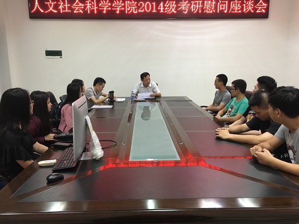 2014级考研慰问座谈会在人文院办204顺利举行。人文学院党委郑志刚副书记、人文学院团委叶阁泽书记出席此次座谈会。