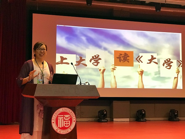 “大学之道,在明明德,在亲民,在止于至善”,福大图书馆博学厅里传来朗朗书声,人文学院薛美秀老师正带领着17级新生诵读《大学》,举行成人礼。