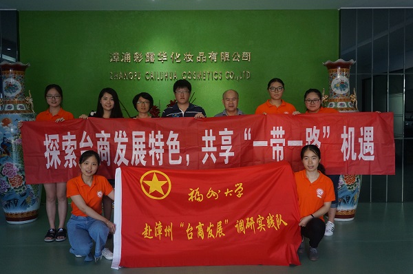 人文学院赴漳浦“台商发展”调研实践队的队员们在中共漳浦县委台办主任和福大人文学院2015级辅导员王薇薇老师的带领下参观了台资企业——漳浦彩露华化妆品有限公司。