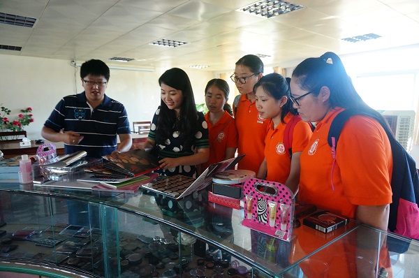 队员们在公司生产经理吴达恩先生的引导下,先后参观了彩露华公司化妆品的主要系列以及陈列柜上公司自主研发的核心产品。吴达恩先生告诉队员们,公司现在拥有自己的核心产品技术和自主研发团队,同时顺应时代发展,在互联网经济发展的当下,主攻网络销售,网络销售成绩喜人。当前彩露华化妆品有限公司的主营品牌是“玻儿彩妆”,企业准确地将销售的目标人群定位在17-30岁的女性群体。当队员们问到产品销售方向时,吴达恩先生给出了准确的企业定位目标:“七成外销,三成内销”,市场广阔,前景十分可观。
