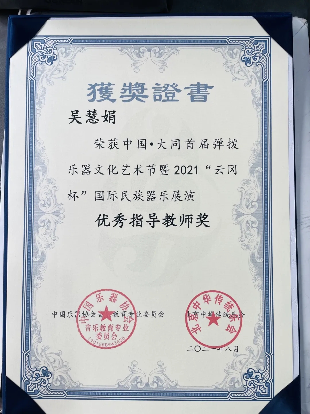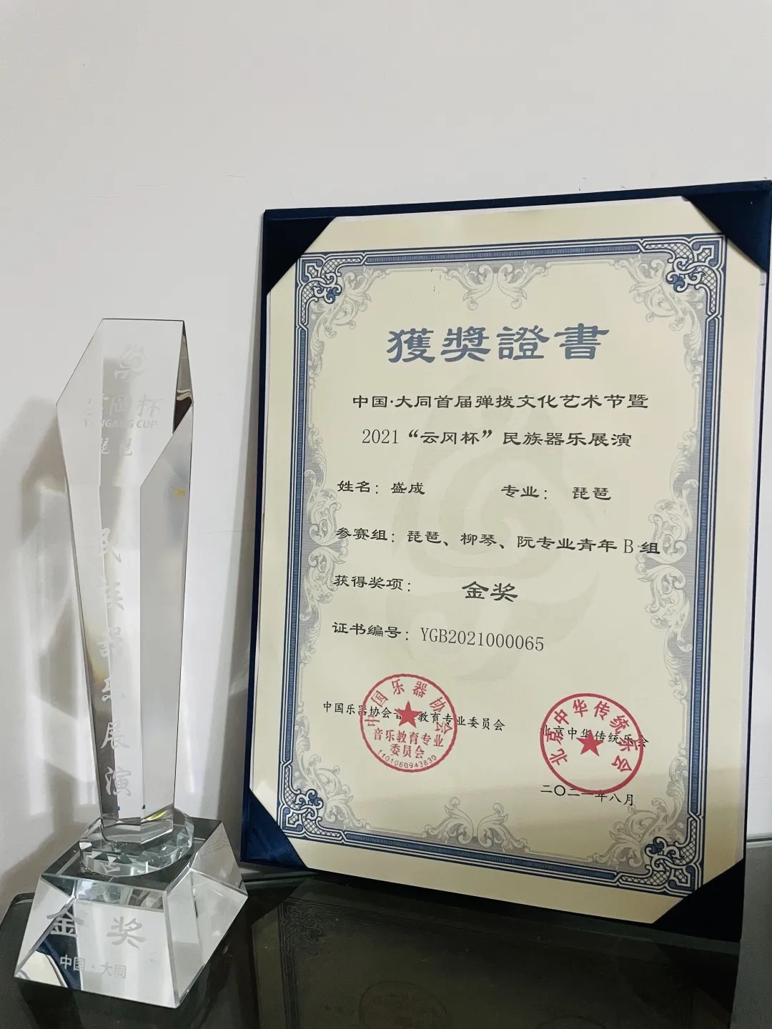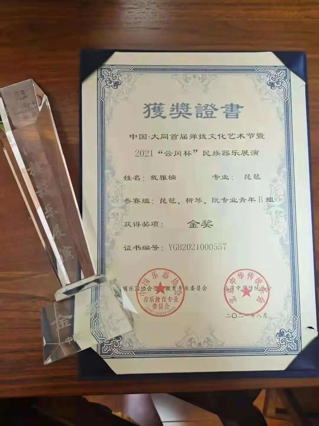 本次赛事由中国乐器协会音乐教育专委会、大同夺目兆兴文化传媒主办,北京中华传统乐会、国际音乐家协会协办。在琵琶专业青年 B 组中共有149人进入复赛,经过3天的激烈选拔,盛成同学凭借一首抒情委婉、细腻有致的《陈隋》、戴雅楠同学凭借一首清幽雅致《虚赖》,荣获2021“云冈杯”民族器乐展演专业青年B组金奖。指导老师吴慧娟教授同时荣获优秀指导教师奖。
