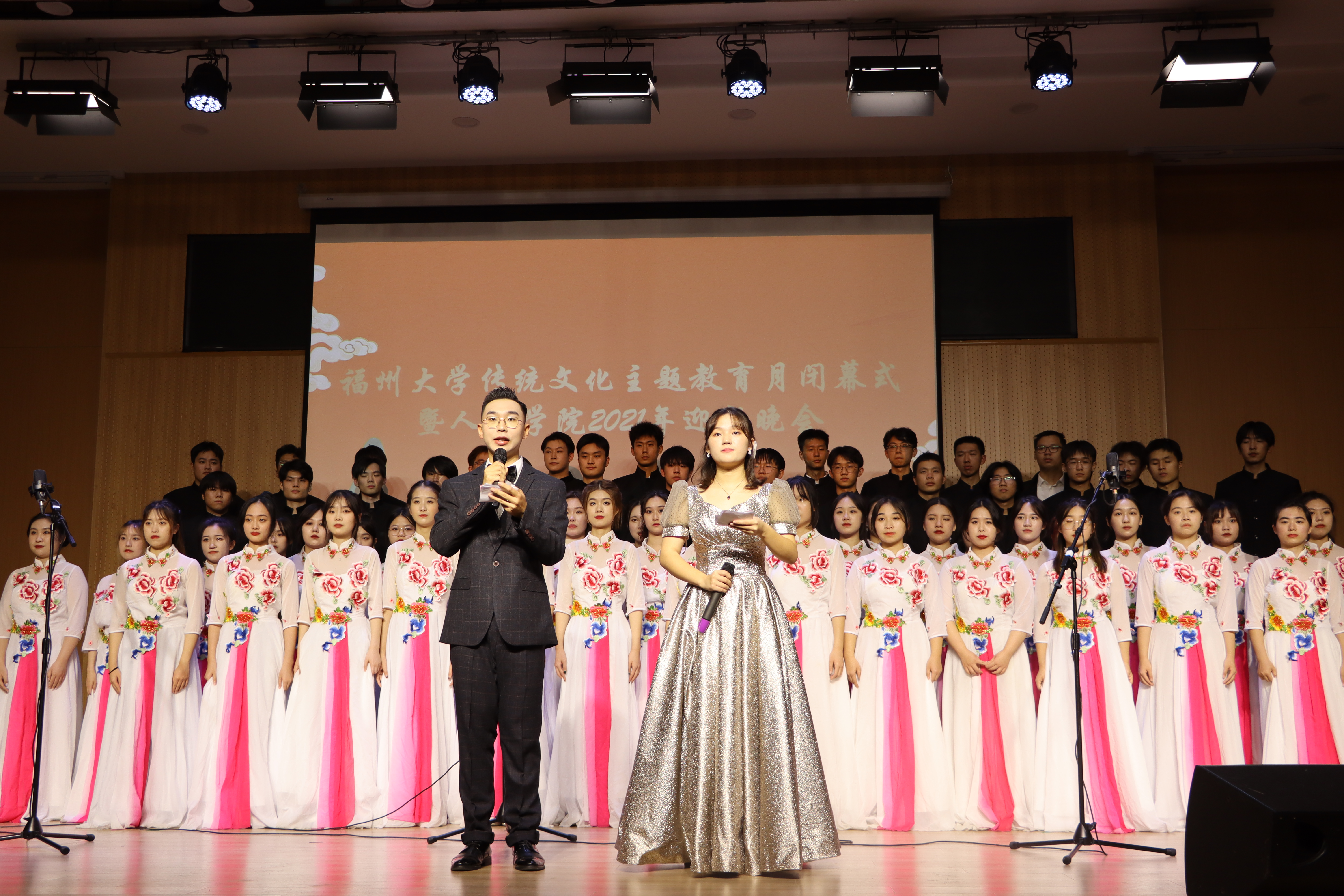 传统文化主题教育月闭幕式暨人文学院2021年迎新晚会在旗山校区艺术实践基地隆重举行。人文学院党委王群书记、团委齐朝阳书记、辅导员房菁、李益僮与人文学院学生代表齐聚一堂,共赏精彩节目。