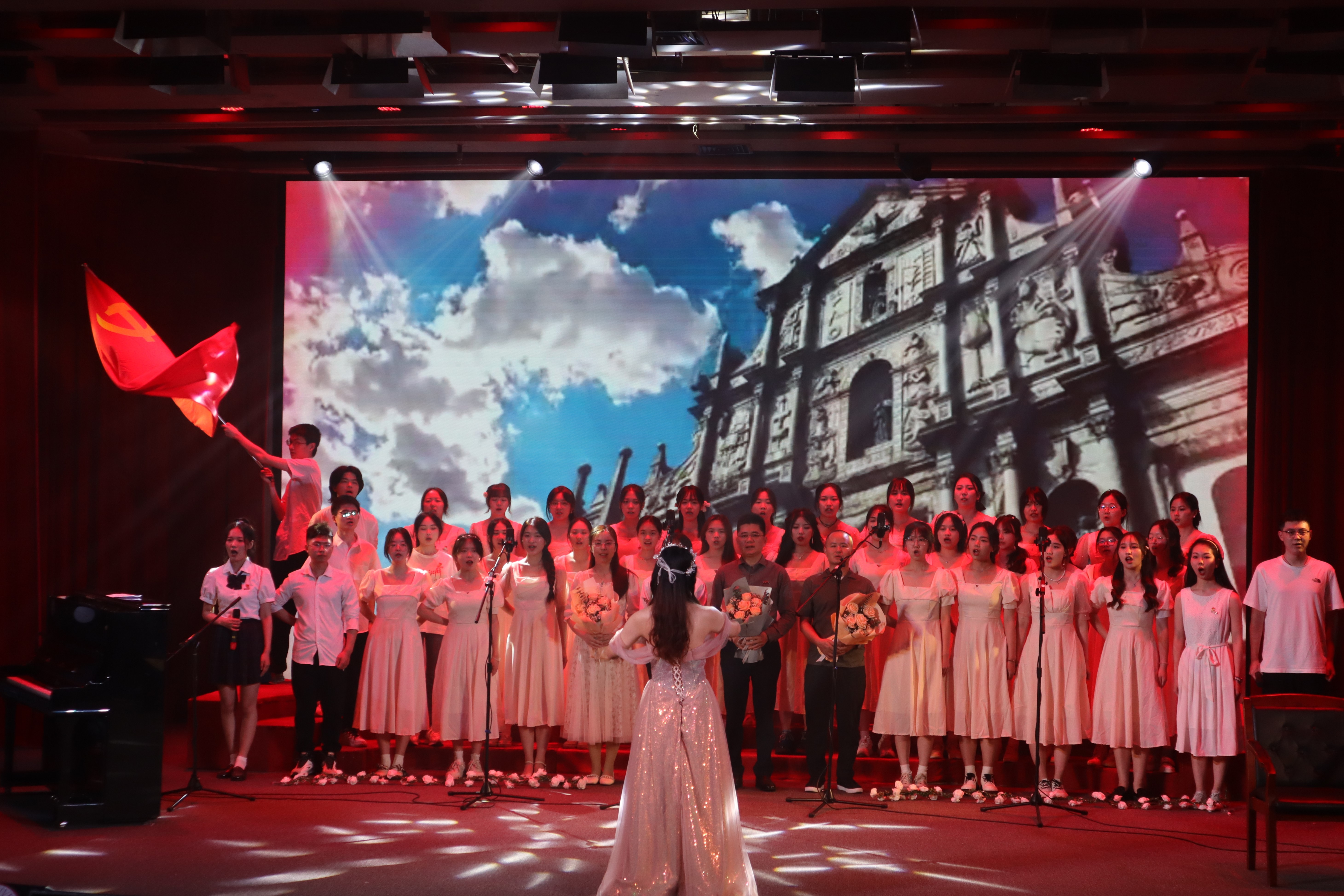在普通组合唱中,同学们精心准备,舞台精彩纷呈。《大中国》《强国一代有我在》《祖国不会忘记》表达着对祖国的美好祝福;《我爱你中国》《七子之歌》《我和我的祖国》诉说着对党和祖国母亲的深深眷恋;《倔强》《我的未来式》《仰望星空》展现当代青年不服输,勇敢追梦的青春宣言;《别看我只是一只羊》尽显青春活力,用童年经典引发同学们的共鸣,现场气氛高涨,欢呼不断;《萱草花》合唱结合书法展示,彰显人文特色,丰富人文内涵;《凤凰花开的路口》运用光影技术将青春回忆可视化,许愿未来一路生花。