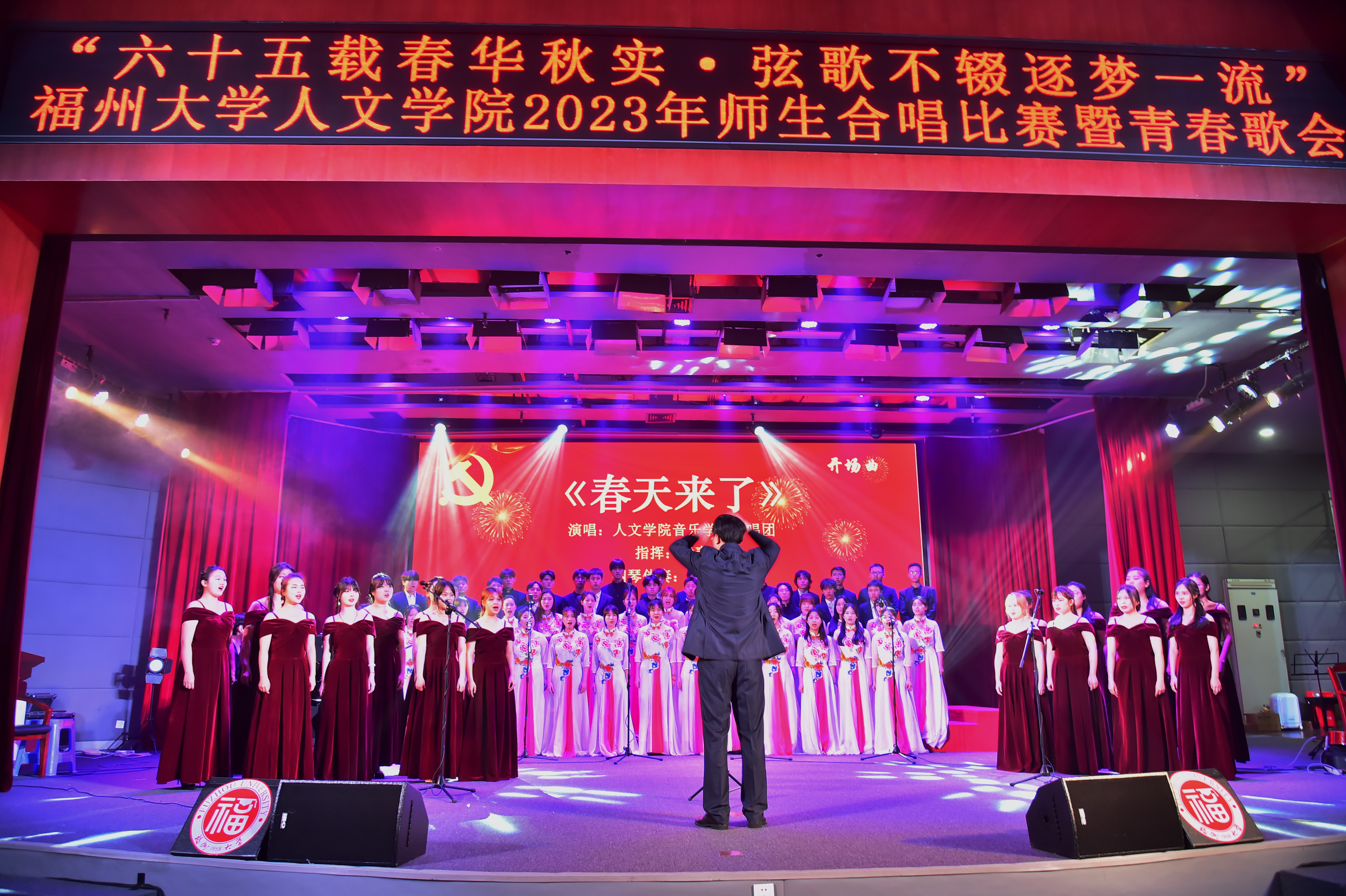 建校65周年,充分展现人文师生对祖国的崇敬与热爱,人文学院在旗山校区图书馆博学厅举办“六十五载春华秋实,弦歌不辍逐梦一流”2023年师生合唱比赛暨青春歌会。校学生工作部(处)部(处)长魏金明教授,人文学院党委王群书记、院长吴慧娟教授、党委副书记陈永福教授及各系、各办公室老师们、全体专兼职辅导员等出席本次歌会,学院500多名师生参加了本次活动。除了从各班推选出的大众评委外,本次比赛邀请了来自音乐家协会、合唱协会、福建高校等组织单位的音乐专业教师担任评委。